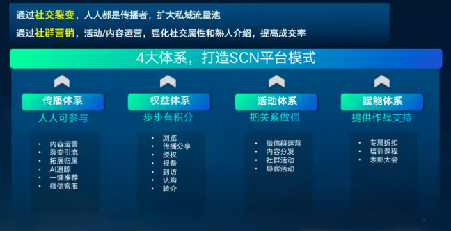 而SCN体系则是通过强化前期的传播和获客环节,对全民营销进行了模式创新。